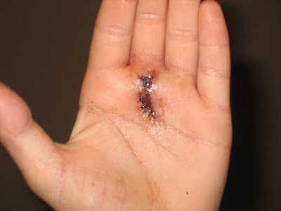 Parker, Corbin and some friends were playing on the trailer (a HUGE NO NO) and the hitch part fell on Parker's hand and sliced it up pretty good. Neither Brent or I believed him as he came screaming "I'm going to die!" He cries wolf A LOT! But once we had a look at the bleeding mess we thought better, pawned the kids off at neighbors and rush our "dying" son to the ER. The car ride went like this: